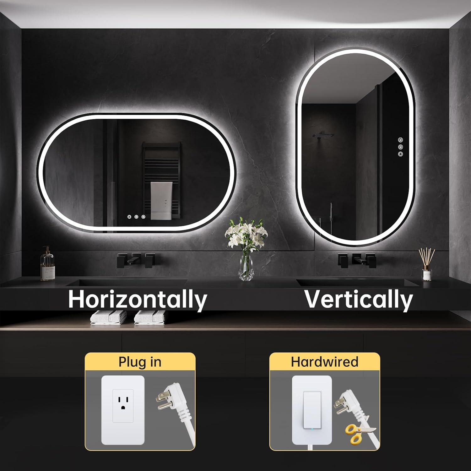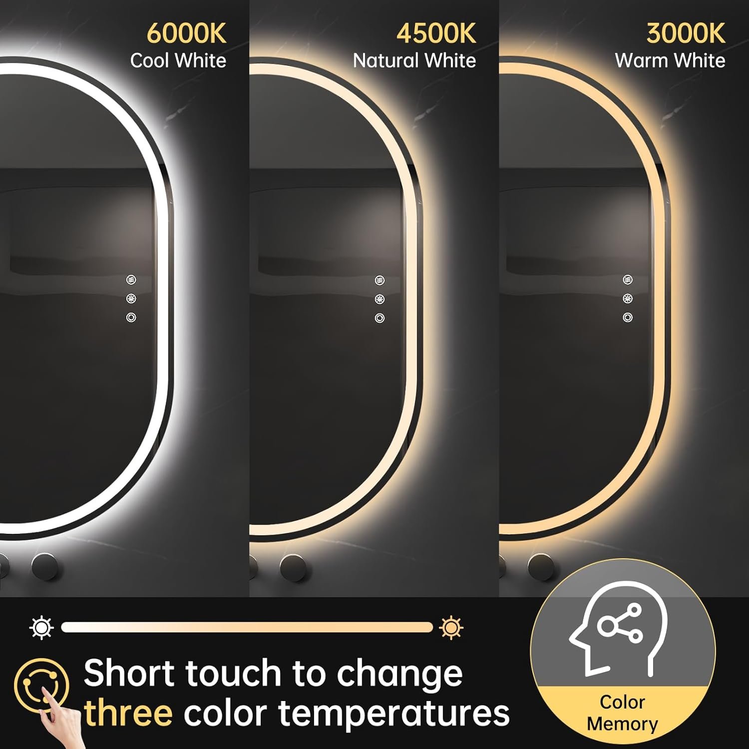 【3 Color Temperature & Brightness Adjustable】Using this oval bathroom mirror, you can enjoy the convenience of three adjustable color temperatures( Cool white 6000K, natural white 4000K, warm white 3000K) and brightness levels(From 0%-100% dimmmable), which can be tailored to your preferences for the perfect lighting in any situation.