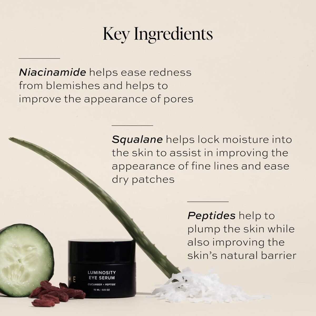 UNDER EYE CREAM: Ditch the appearance of dark circles and under-eye bags with our Luminosity Eye Serum! This powerful cooling serum is packed with Super Star Ingredients like goji berry, grape seed extract, cucumber extract, and peptides. Notice a difference with our Luminosity Eye Serum.