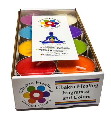 THE SCENTS ARE UPLIFTING! The chakra candles in this set are lightly infused with scents corresponding to each of the seven chakras, which are energy centers in the body. The colors and scents are Red: Cedarwood, Orange: Jasmine, Yellow: Lemon, Green: Rose, Light Blue: Eucalyptus, Deep Purple: Sage, Violet: Frankincense, and White: Ylang-Ylang. These colored and scented tealight candles are designed to help balance and align the chakras, promoting physical, emotional, and spiritual well-being.