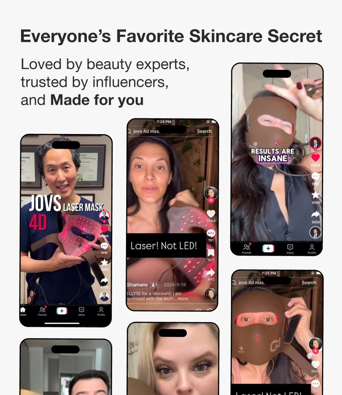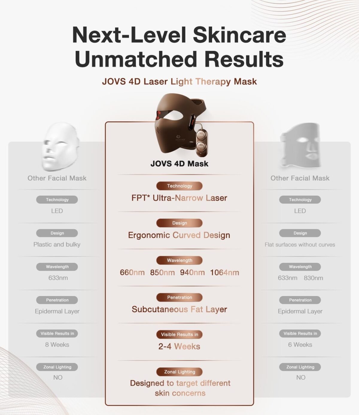 Unveil Your Glow with JOVS: Smooth away wrinkles and banish dark circles with the JOVS 4D Laser Light Therapy Mask. After real-person testing, it have visible result within 4 Weeks. Our brand proposition is to offer more professional, yet simplified solutions that seamlessly integrate into daily life. Infinite Innovation for a Timeless Glowing!