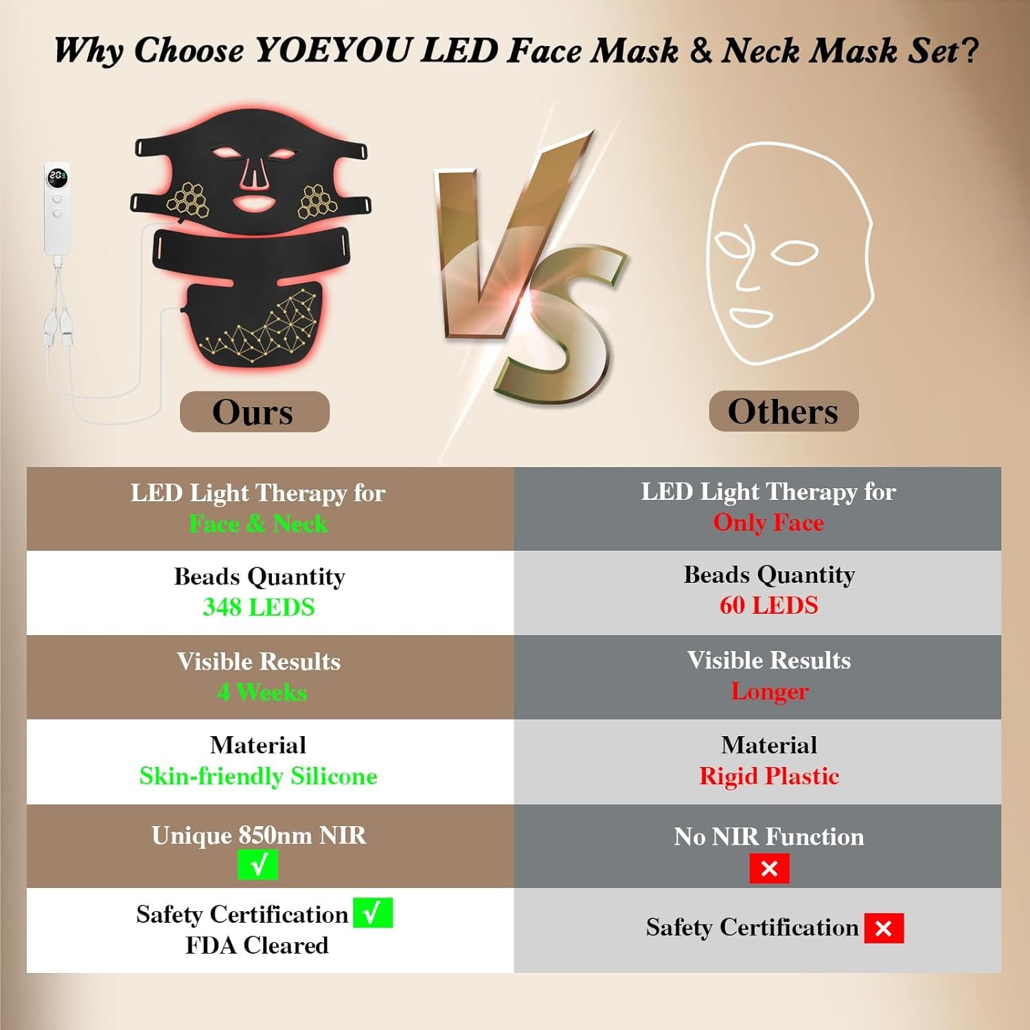 【Scientifically Proven, Designed for You】YOEYOU red light mask for face and neck has been approved by multiple globally safe certification like F-D-A, FCC, CE, ROHS and so on. The LED mask set is packaged in an exquisite gift box, giving you a perfect surprise. Choose YOEYOU LED mask set and enjoy 24/7 customer service, 365-day warranty and visible beauty experience. If you have any questions, please contact us at any time.