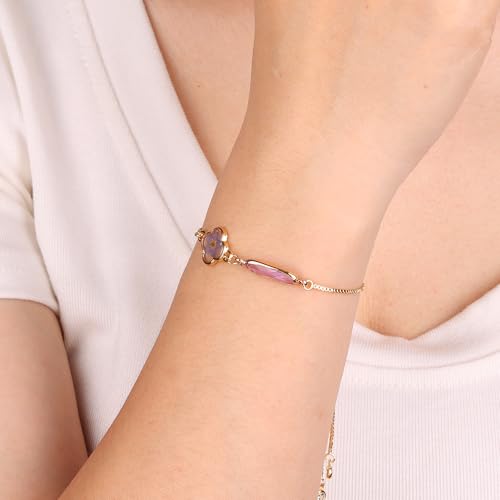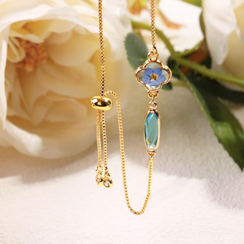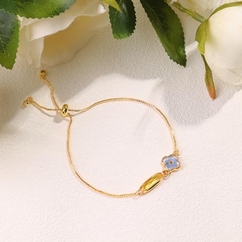 Handmade Pressed Forget-Me-Not Flower Birthstone Bracelet – Real Flower Resin Jewelry – Adjustable Gold Clover Charm Bracelet for Women – Personalized Gift